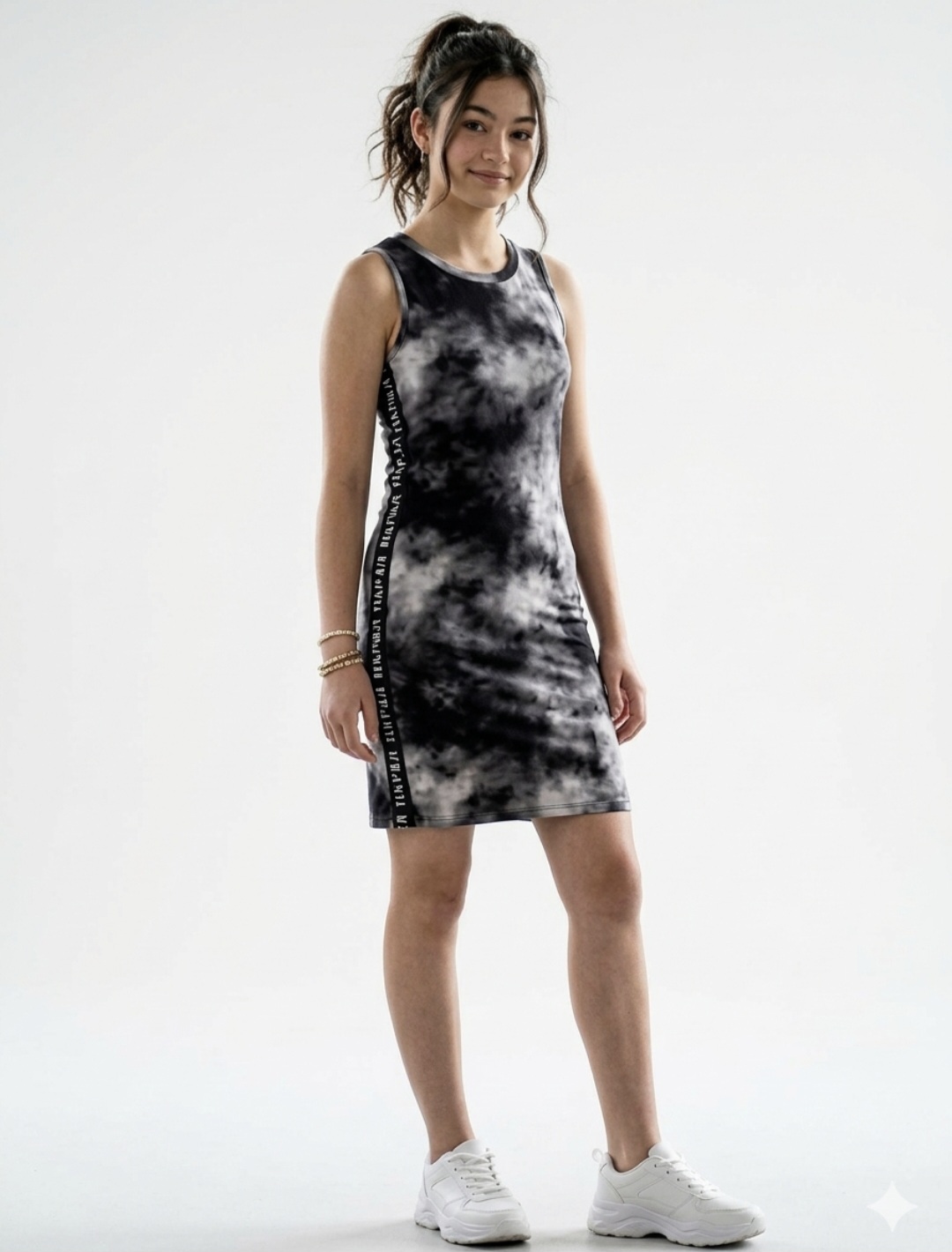 Vestido para menina confeccionado em meia malha stretch estampada. Superestiloso e confortável, possui modelagem regata, laterais contam com elástico com lettering da marca e estampa com efeito tie-dye em toda a peça. Aposte!